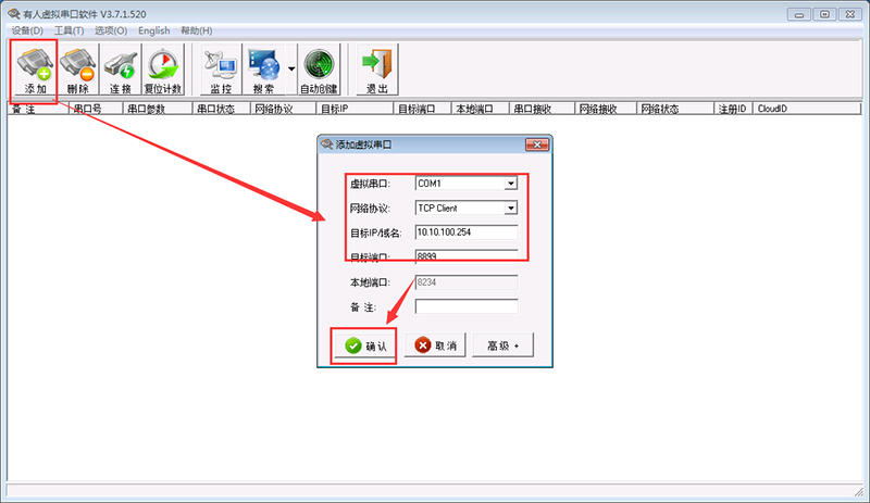 1>添加虛擬串口,網(wǎng)絡協(xié)議TCP client,服務器IP地址10.10.100.254,服務器端口號8899,確認