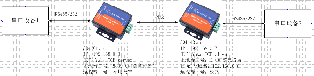 網(wǎng)絡(luò)拓?fù)浣Y(jié)構(gòu): 串口設(shè)備1發(fā)送數(shù)據(jù)--->304(1)--->304(2)--->串口設(shè)備2接收數(shù)據(jù)