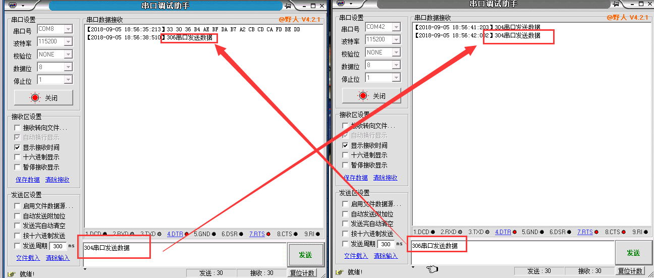 7. 電腦端打開兩個串口調(diào)試軟件,通過304和306的串口發(fā)送數(shù)據(jù)