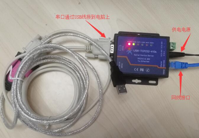 1. 將410S(USR-TCP232-410S,簡(jiǎn)稱(chēng) 410S下同)的串口通過(guò)串口線(xiàn)(或USB 轉(zhuǎn)串口線(xiàn))與計(jì)算機(jī)相連接,通過(guò)網(wǎng)線(xiàn)將 410 的網(wǎng)口 PC 的網(wǎng)口相連接,檢測(cè)硬件連接無(wú)錯(cuò)誤后,接入我們配送的電源適配器,給 410 供電。觀(guān)察指示燈狀態(tài)確定410是否正常工作:電源指示燈常亮,工作指示燈閃爍。