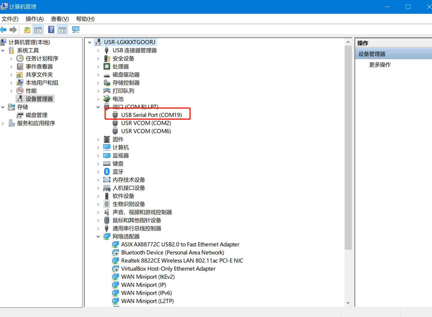 串口設(shè)置端: 打開設(shè)備管理器查看232轉(zhuǎn)usb端口號(hào),COM19,設(shè)置57600,N,8,1,打開串口