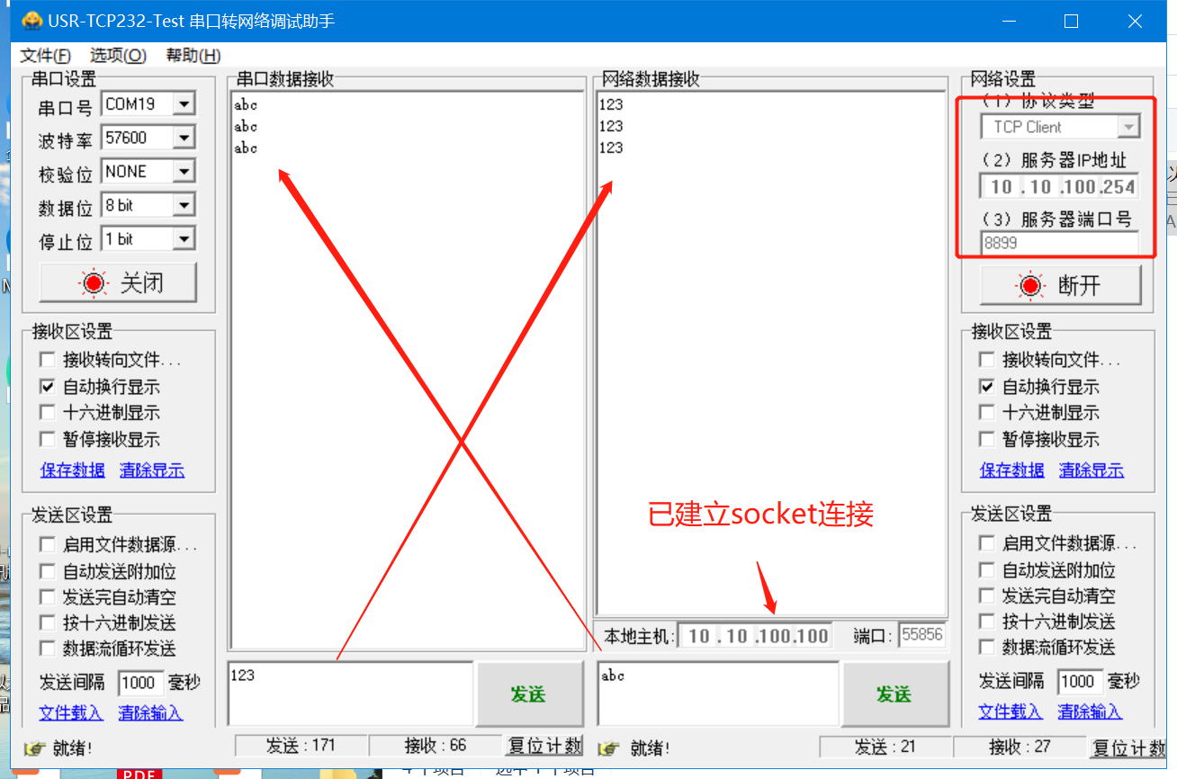 網(wǎng)絡(luò)設(shè)置端:TCP client,服務(wù)器IP地址10.10.100.254,服務(wù)器端口號(hào)8899,連接從下圖可以看出,串口和網(wǎng)絡(luò)端可以正常的雙向數(shù)據(jù)收發(fā)