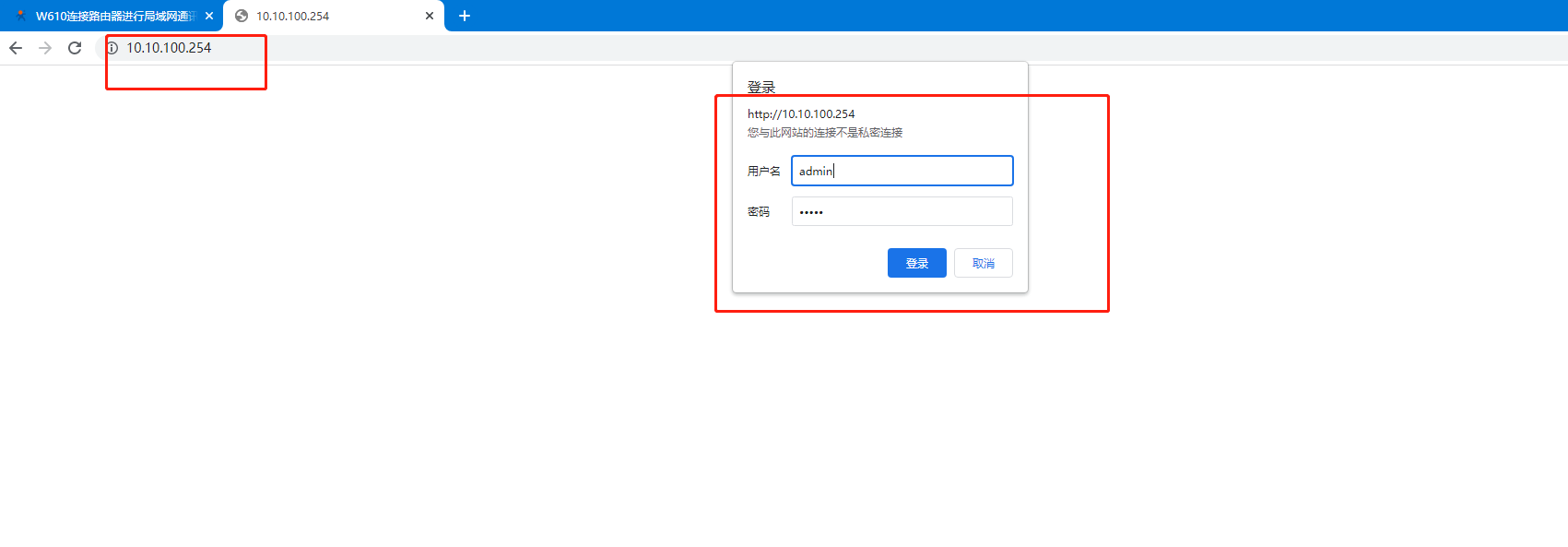 3、用瀏覽器打開W610的IP地址(出廠默認10.10.100.254),用戶名和密碼均是admin