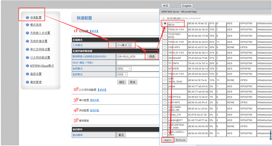 (1)點(diǎn)擊快速配置,選擇STA工作模式,點(diǎn)擊搜索,搜索路由器,選擇要連接的路由器