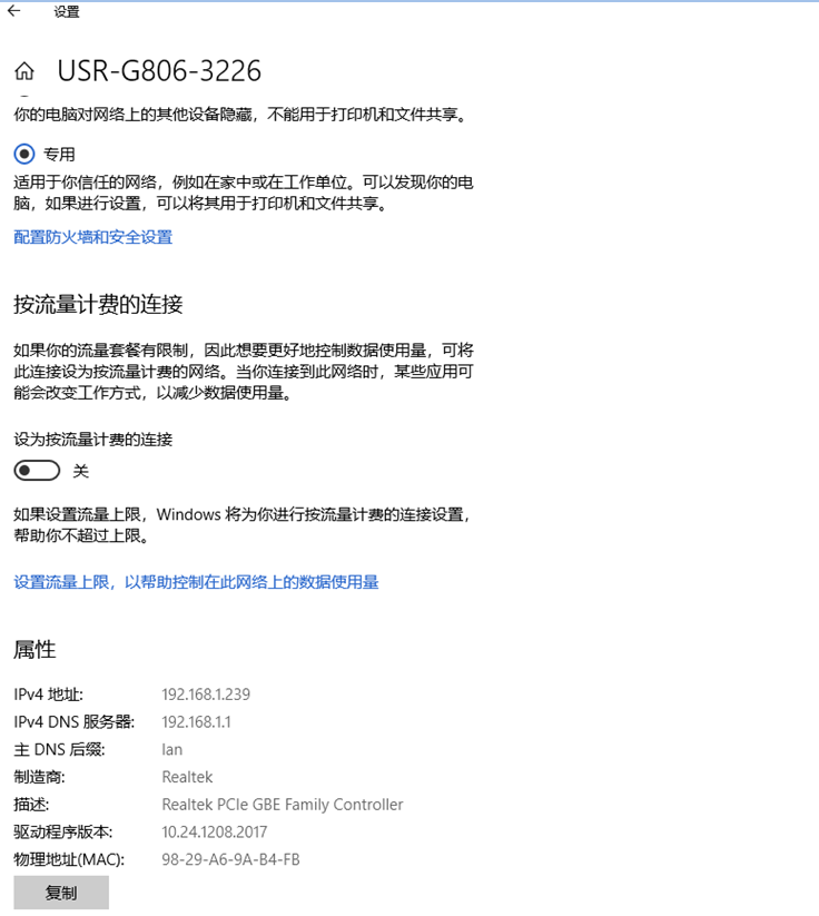 2、 電腦獲取到IP,網(wǎng)關(guān)默認是192.168.1.1,是G806的LAN口IP,也是G806的局域網(wǎng)IP地址。