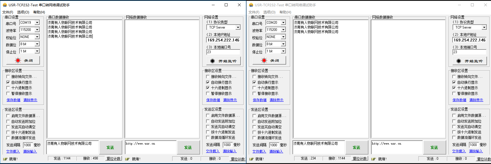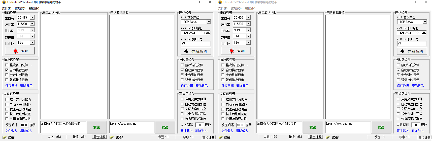 3. 將兩太設備通過網(wǎng)線鏈接,分別用USB轉(zhuǎn)232串口線將他們鏈接到電腦上,打開兩個測試軟件(USR-TCP232-Test-V1.3),分別打開兩者對應的串口: