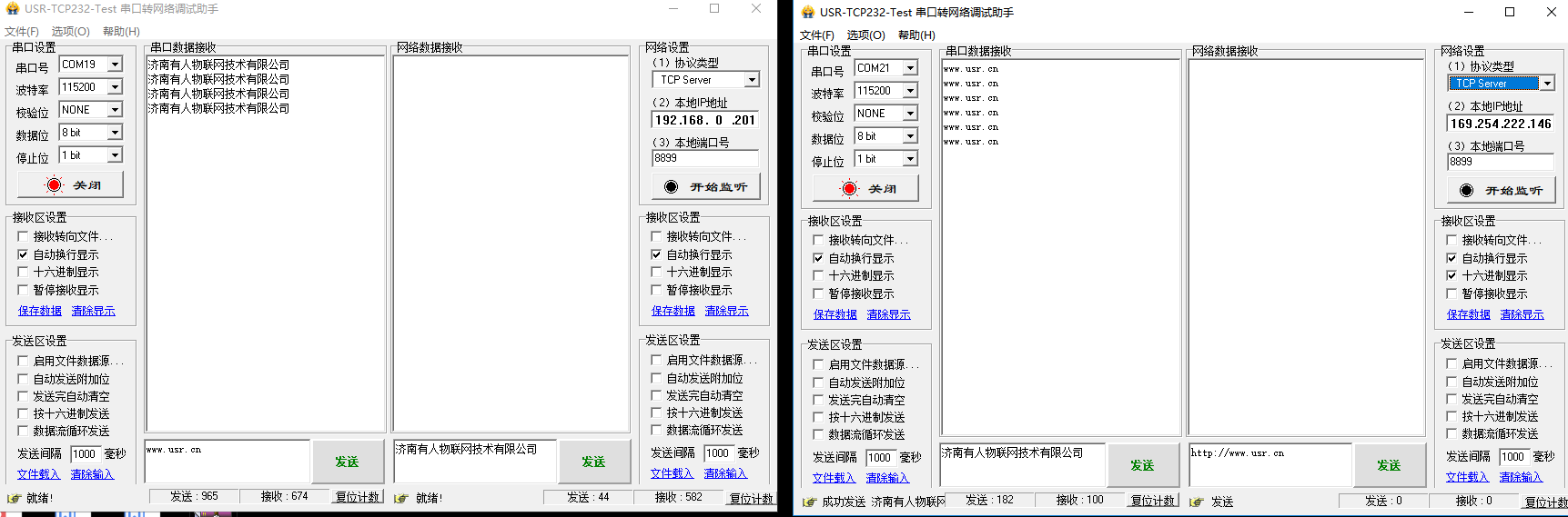 3. 將兩太設(shè)備通過(guò)網(wǎng)線鏈接,分別用USB轉(zhuǎn)232串口線將他們鏈接到電腦上,打開兩個(gè)測(cè)試軟件(USR-TCP232-Test-V1.3),分別打開兩者對(duì)應(yīng)的串口: