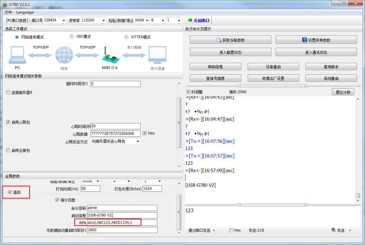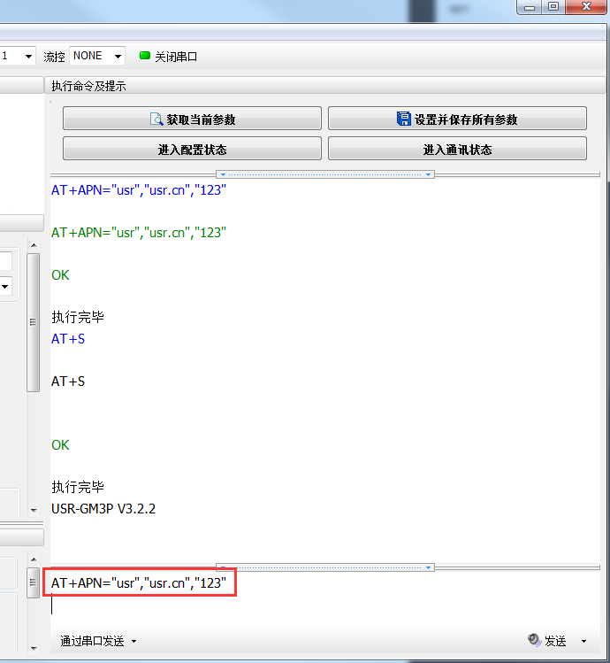 也可以用AT指令來設(shè)置的AT+APN=”usr”,”usr.cn”,”123”