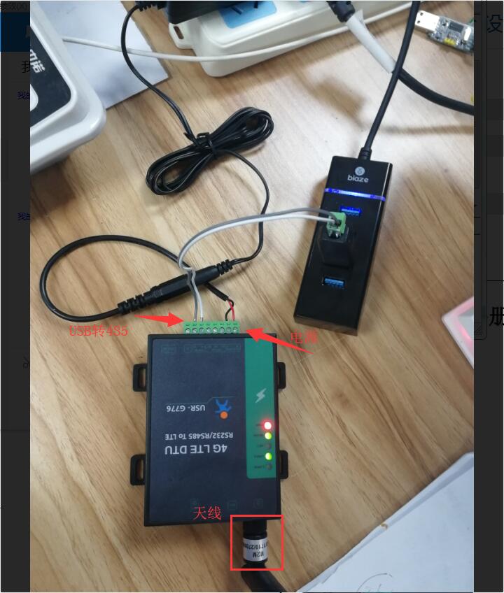 (1) 硬件連接:裝上sim卡,接上天線,G776的串口通過UAB轉(zhuǎn)RS232/485接到PC上,用我司提供的適配器供電。帶白條的那根線是正極,帶字母的那根線是負(fù)極。注意G776的RS232和RS485不能同時(shí)發(fā)送數(shù)據(jù),設(shè)置的時(shí)候只接一個(gè)串口就可以了