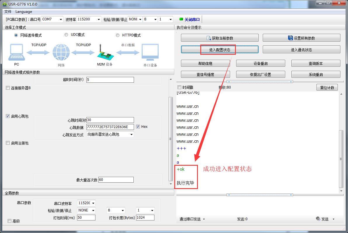 3. 點(diǎn)擊進(jìn)入配置狀態(tài),沒有收到+OK,只有3個(gè)+++