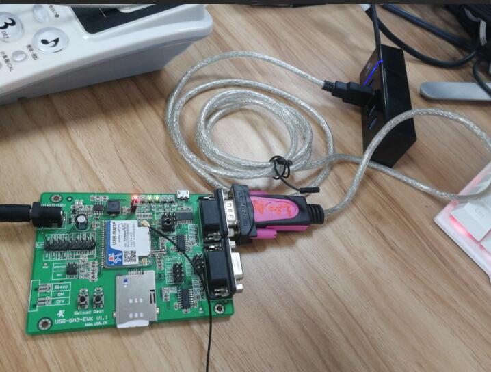 1. 將模塊通過(guò)串口連接到PC上,GM3系列的以GM3P+EVK來(lái)示例。裝上gprs天線,裝上支持短信的移動(dòng)sim卡,上電。