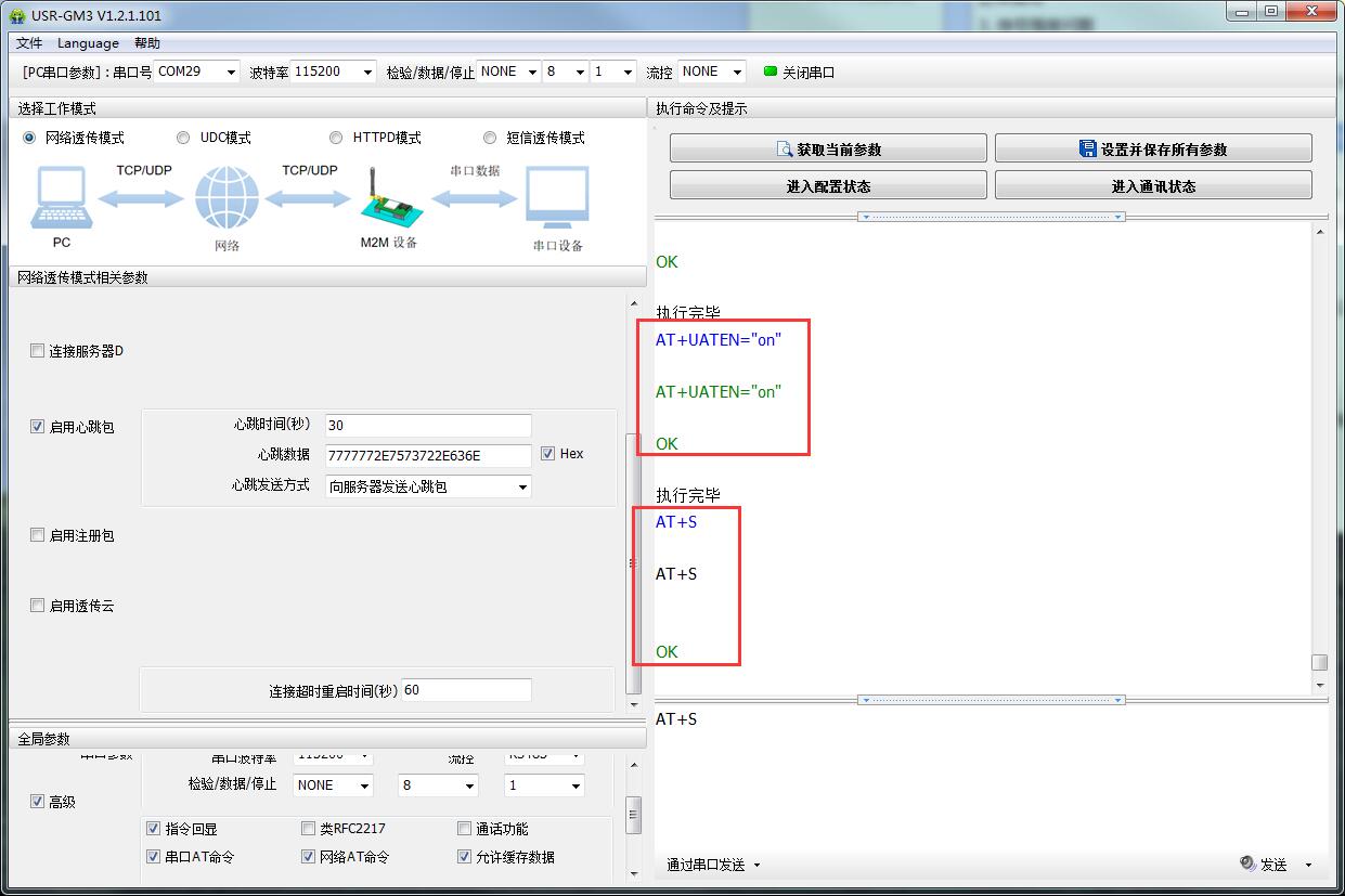 3. 通過(guò)AT指令使能串口AT指令,對(duì)應(yīng)的AT指令是AT+UATEN=”on”,然后發(fā)送AT+S保存參數(shù),模塊重啟后,既可以使用串口AT指令了