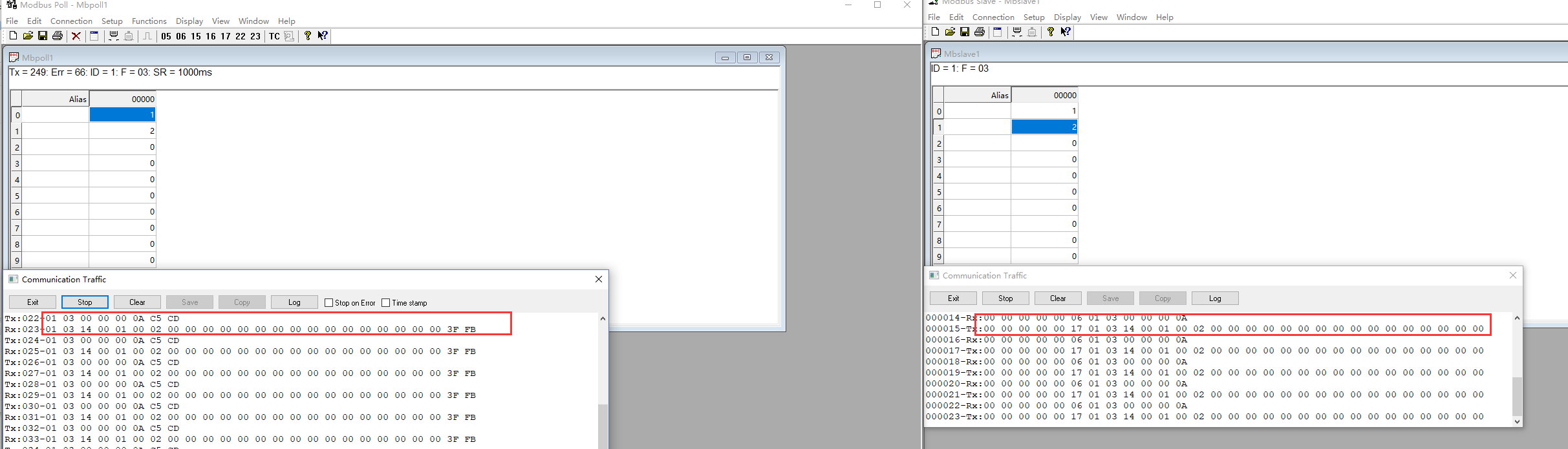 (8)數(shù)據(jù)通信。在Modbus slave軟件中修改對(duì)應(yīng)寄存器的值,在Modbus poll軟件中會(huì)對(duì)應(yīng)自動(dòng)讀取到改變后的值。