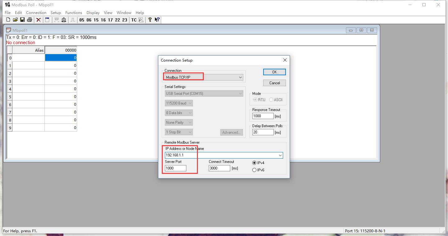 設(shè)置Modbus poll,點(diǎn)擊Connection----connect,設(shè)置參數(shù)如下圖所示,選擇Modbus TCP/IP,填寫對(duì)應(yīng)的服務(wù)器的IP192.168.1.1和端口號(hào)1000.點(diǎn)擊OK