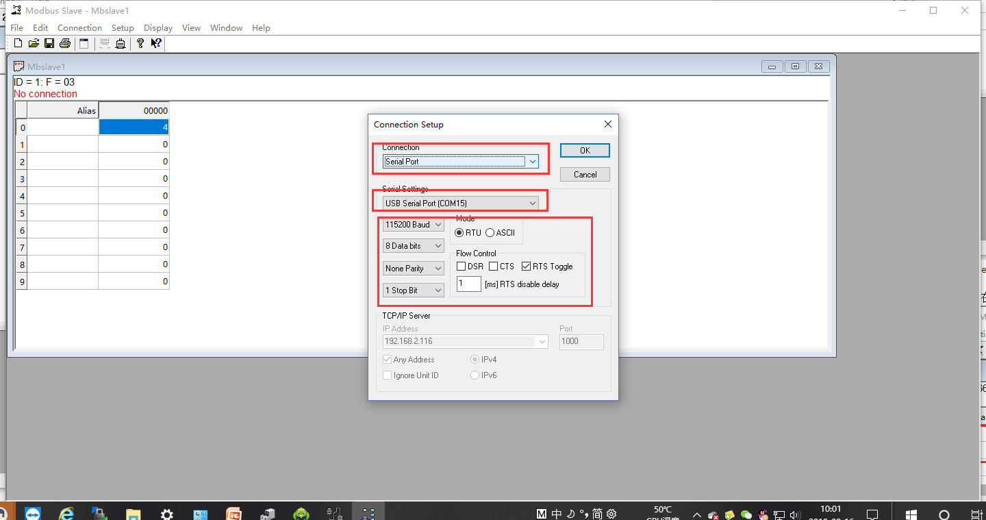 設(shè)置modbus slave,點(diǎn)擊Connection----connect,設(shè)置參數(shù)如下圖所示,選擇對(duì)應(yīng)的串口參數(shù)并點(diǎn)擊OK(注意先將設(shè)置軟件關(guān)閉串口)。