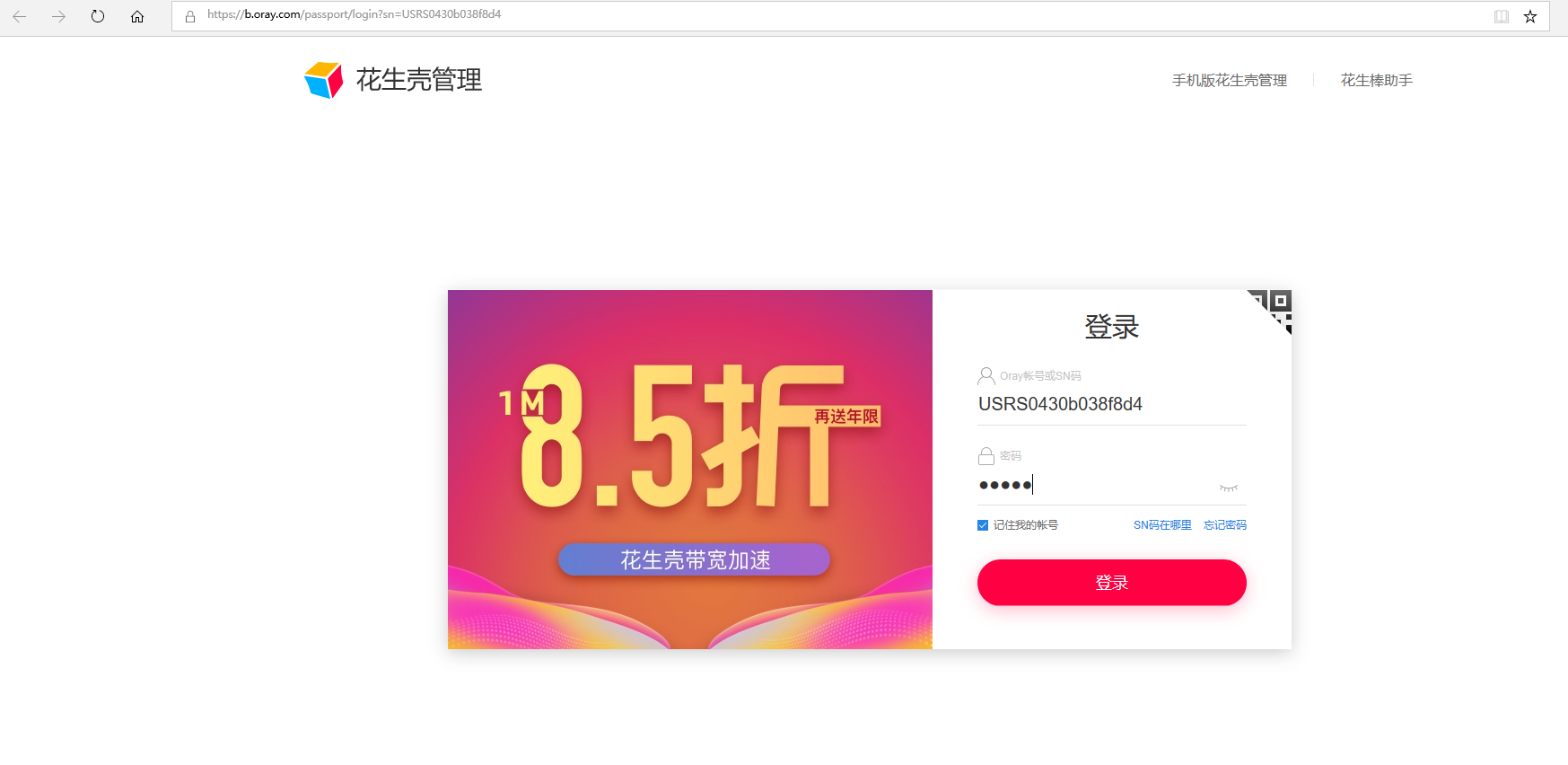 2、點(diǎn)擊登陸管理,頁(yè)面跳轉(zhuǎn)到花生殼登陸頁(yè)面,自動(dòng)識(shí)別設(shè)備sn,默認(rèn)密碼admin。點(diǎn)擊登陸。