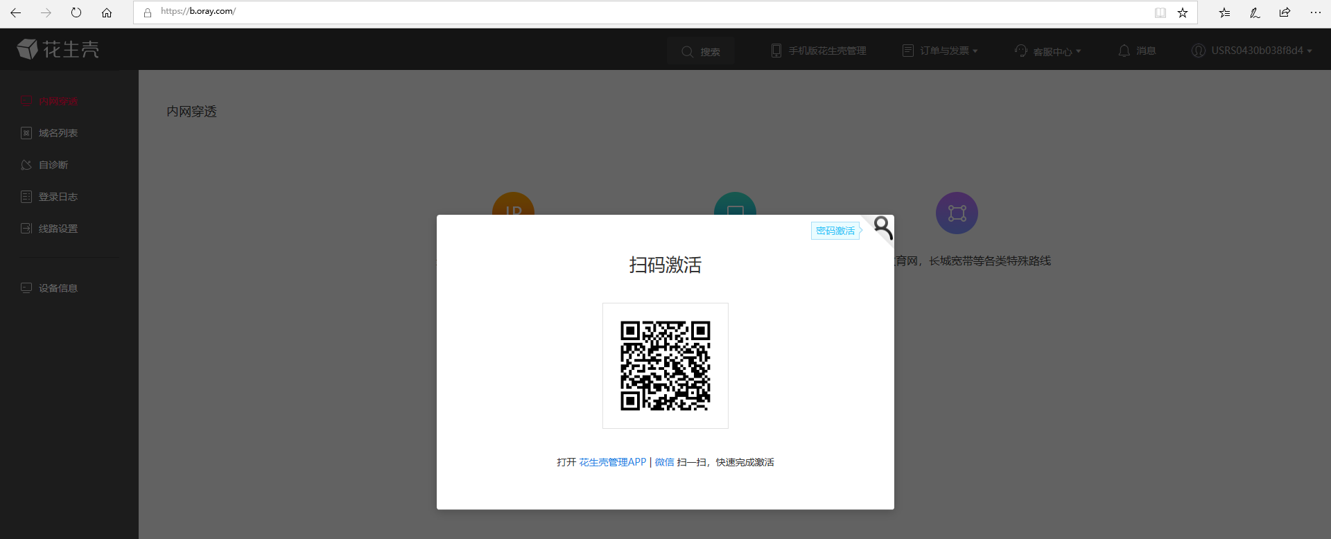3、進(jìn)入頁(yè)面后顯示掃碼激活??梢杂檬謾C(jī)花生殼APP掃描二維碼激活或者點(diǎn)擊右上角,切換激活方式。