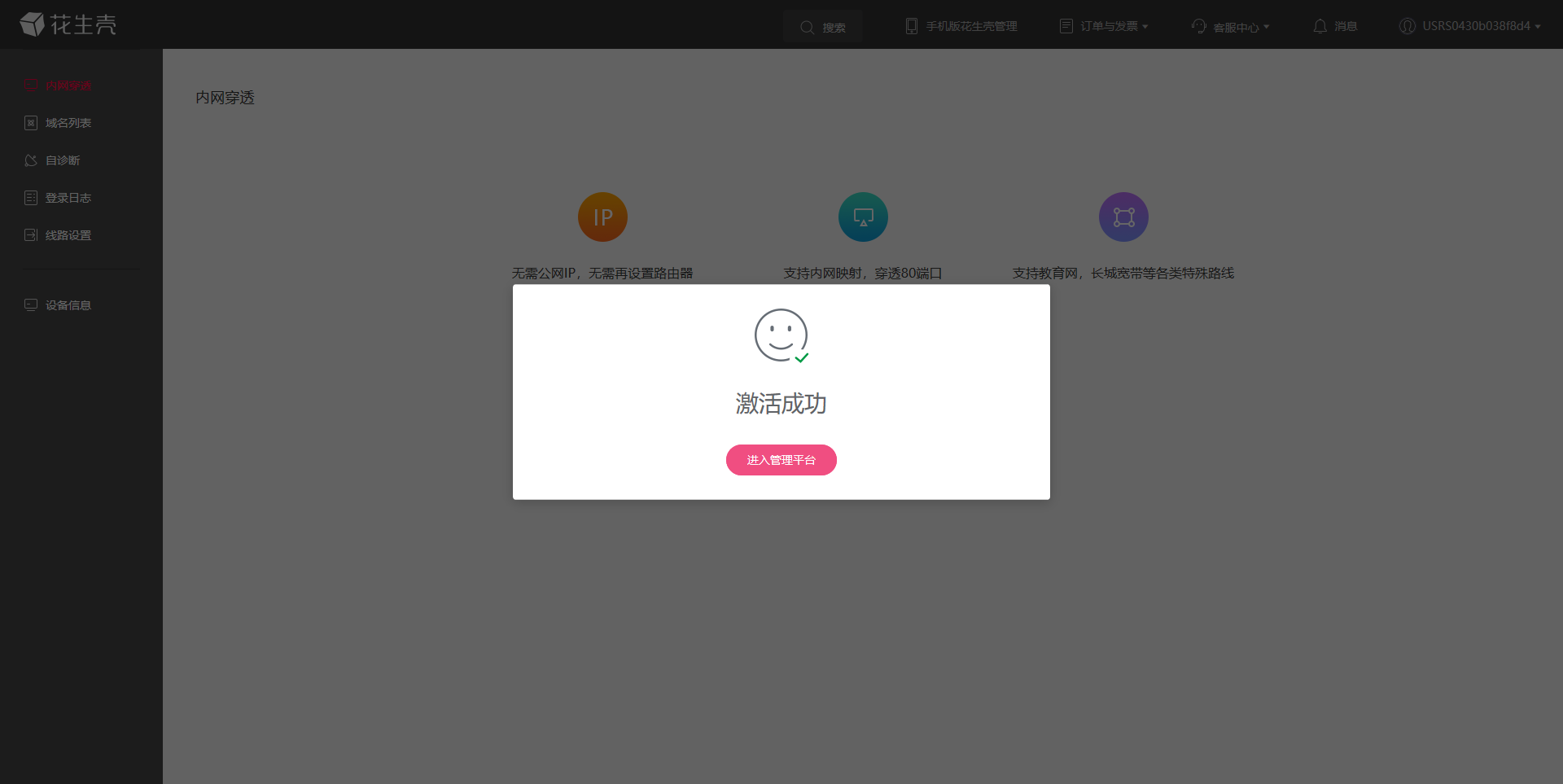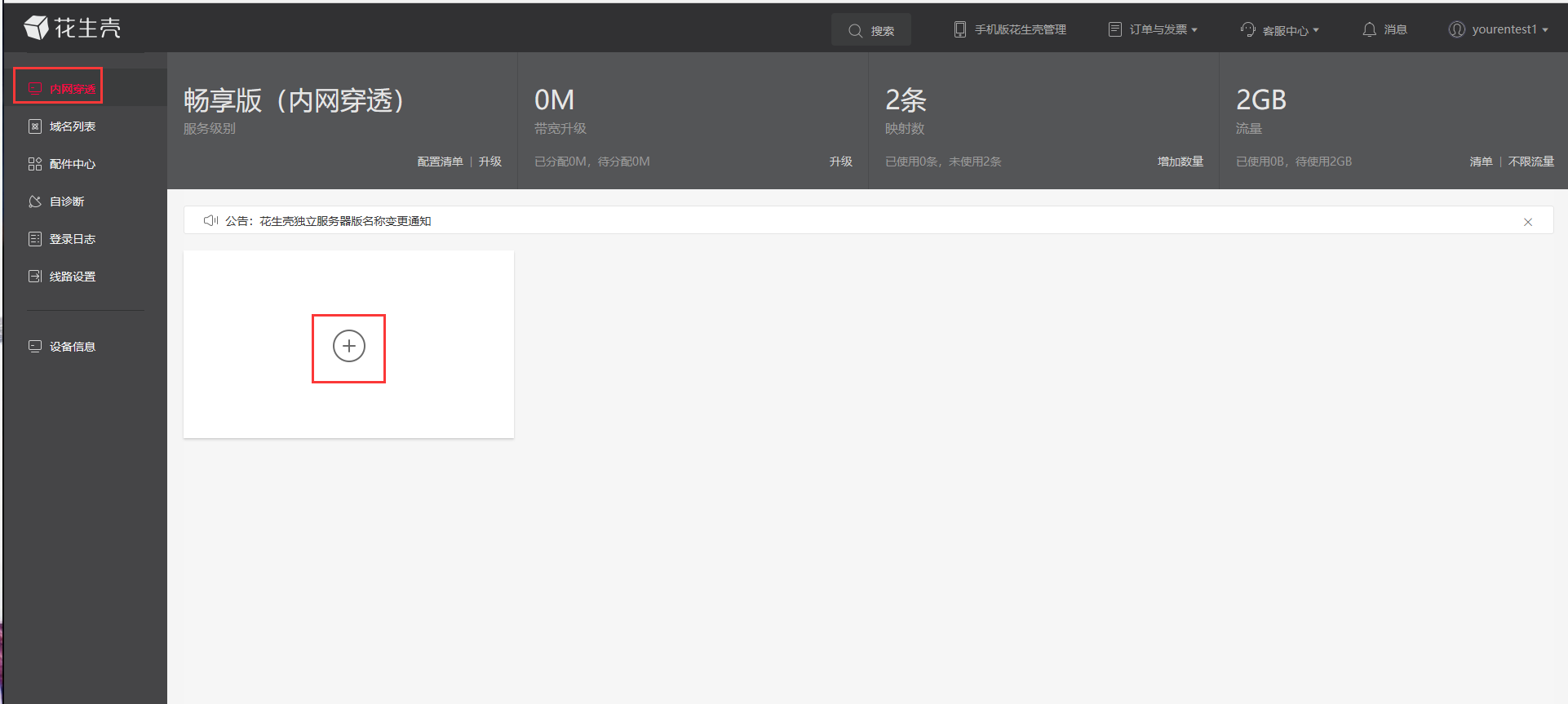 4、左側(cè)導(dǎo)航欄點(diǎn)擊進(jìn)入花生殼內(nèi)網(wǎng)穿透,點(diǎn)擊頁(yè)面上的+,進(jìn)入配置。(默認(rèn)免費(fèi)版本一個(gè)賬號(hào)可以免費(fèi)設(shè)置兩個(gè)內(nèi)網(wǎng)穿透。)