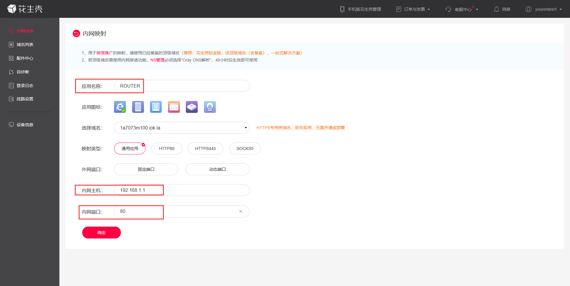 5、應(yīng)用名稱可以自定義,以便于自己區(qū)分。應(yīng)用圖標(biāo)、應(yīng)用域名、映射類型、外網(wǎng)端口可以根據(jù)自己需求來(lái)選擇,有些選項(xiàng)是收費(fèi)的。(具體收費(fèi)細(xì)則可咨詢花生殼的相關(guān)銷售和技術(shù),本功能是第三方應(yīng)用,我司不對(duì)其進(jìn)行收費(fèi)等業(yè)務(wù)辦理。)在這里如下設(shè)置。內(nèi)網(wǎng)主機(jī)填寫路由器的LAN口IP地址,端口是80(路由器的內(nèi)置網(wǎng)頁(yè)固定端口,不可修改).設(shè)置完成后點(diǎn)擊確定。