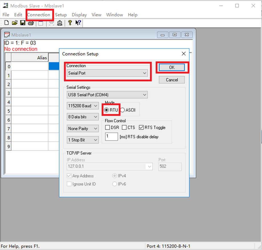 (7)打開modbus slave軟件,點擊Connection按鍵,在菜單中選擇Connect,點擊,出現(xiàn)如下選擇框,按照下圖進行選擇。Connection一欄選擇serial port,串口參數(shù)配置成和781的串口參數(shù)相同,mode選擇RTU,然后點擊ok。