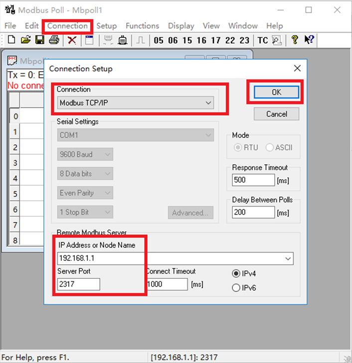 (8)打開modbus poll軟件,點擊Connection按鍵,在選擇框的Connection下選擇Modbus TCP/IP方式,ip地址與端口設置成和781相同的地址,端口,點擊ok