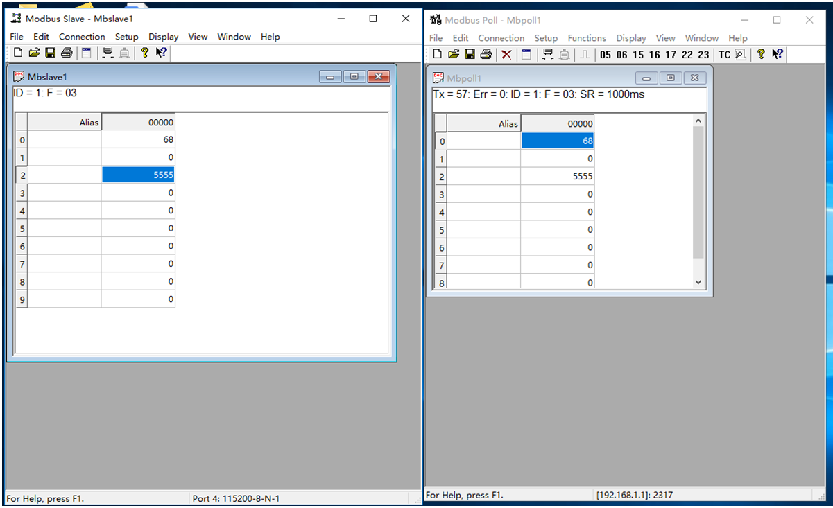 (10)觀察兩個軟件的數(shù)據(jù),修改slave中的數(shù)據(jù),poll中的相應數(shù)據(jù)改變。修改poll中的數(shù)據(jù),slave中的相應數(shù)據(jù)改變。通信成功