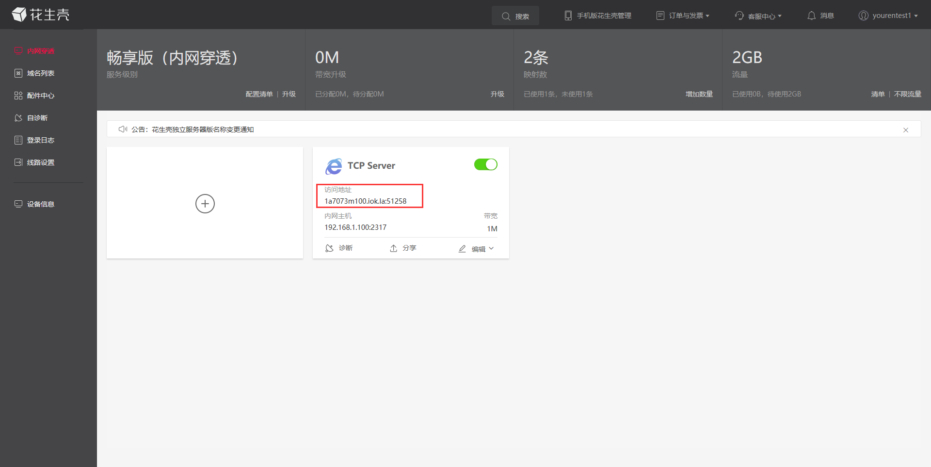 點(diǎn)擊確定后跳轉(zhuǎn)頁面,生成一路內(nèi)網(wǎng)穿透,會(huì)顯示訪問地址,即外網(wǎng)訪問地址。如下所示:外網(wǎng)域名地址為:1a7073m100.iok.la,外網(wǎng)端口為:51258