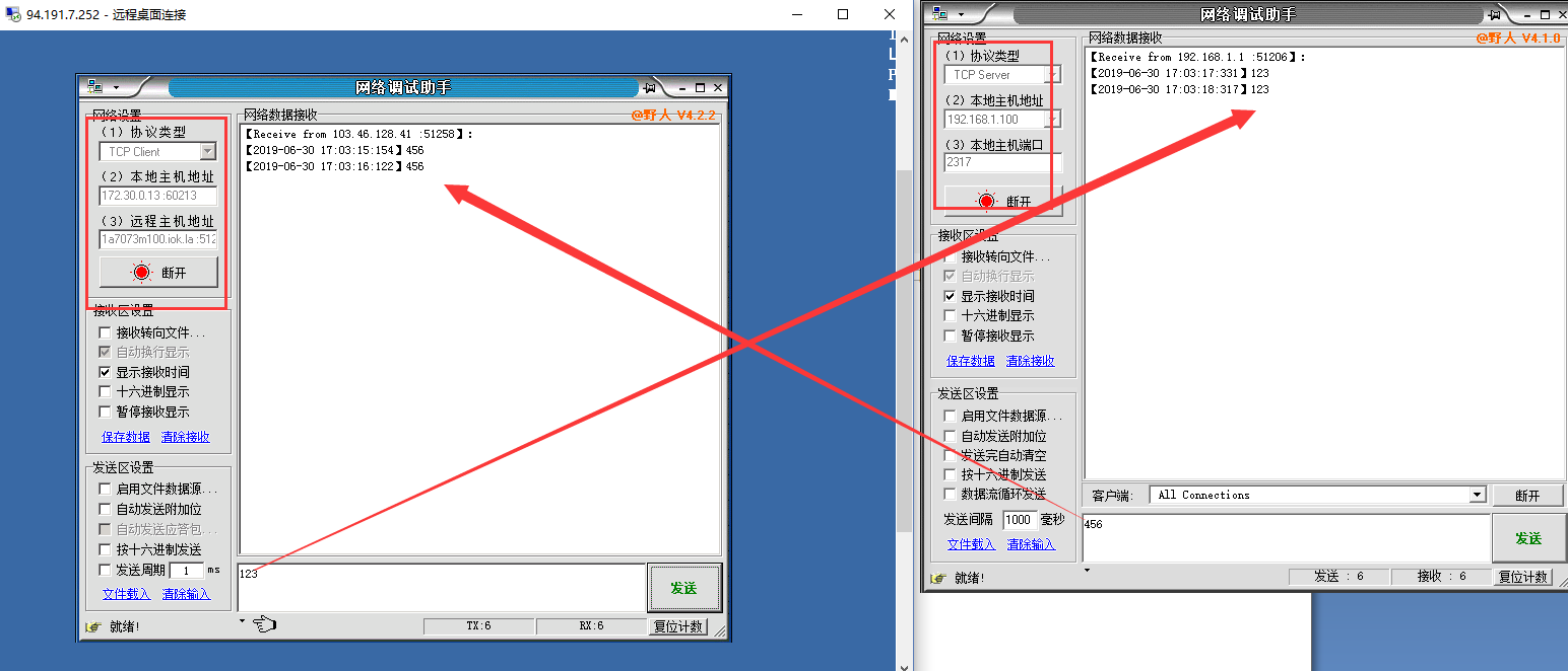 在可訪問公網(wǎng)的PC打開網(wǎng)絡(luò)調(diào)試助手,輸入映射的地址和端口并點(diǎn)擊連接,如下所示,建立連接,并可以雙向數(shù)據(jù)通信