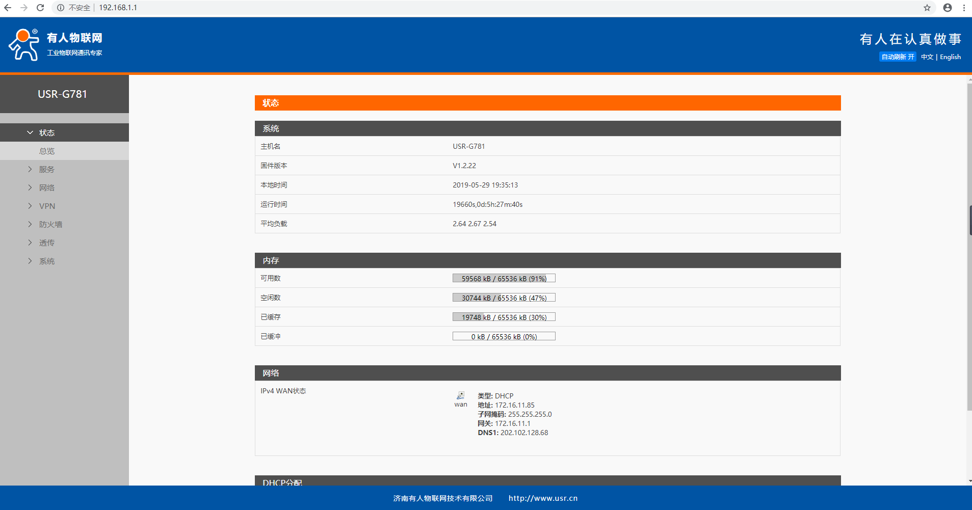 如步驟2所示,PC獲取到IP192.168.1.1,IPV4 默認網(wǎng)關(guān)192.168.1.1即G781的LAN口IP。打開瀏覽器,在地址欄輸入192.168.1.1后回車,彈出登錄界面,填寫用戶名密碼(出廠默認都是admin)點擊確認,即可進入配置網(wǎng)頁。在狀態(tài)----總覽頁面可以看到,當前固件版本是V1.2.22: