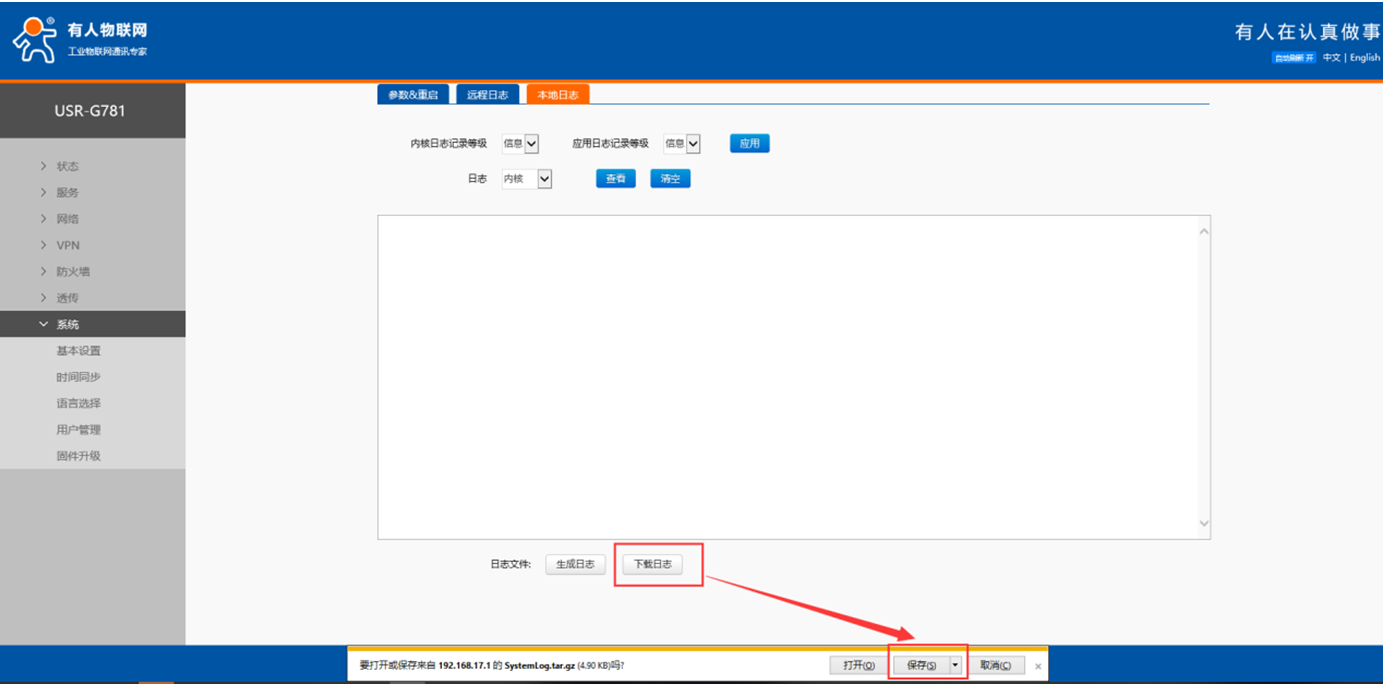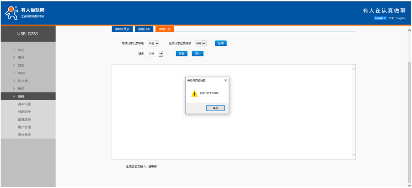 支持日志文件導(dǎo)出(先生成后導(dǎo)出),(不要修改日志等級),先點擊生成日志,后點擊下載日志。之后會生成一個壓縮包,即日志文檔。