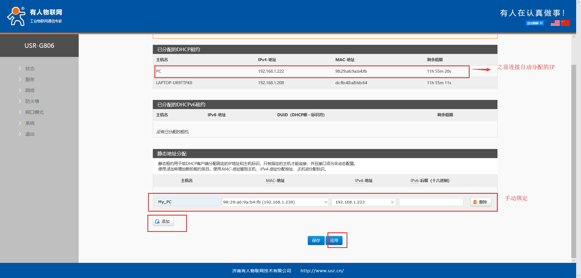 2、 點擊添加,填寫要綁定的LAN口設備的MAC和要綁定的IP: