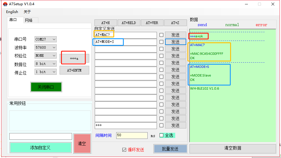 模塊的缺省 UART 口參數(shù)為: 波特率 57600、無校驗(yàn)、8 位數(shù)據(jù)位、1 位停止位。正確打開串口后,點(diǎn)擊“+++a”,接收區(qū)顯示“a+ok”說明模塊進(jìn)入了命令行模式。