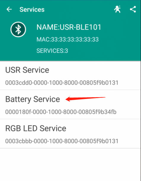 點(diǎn)擊該設(shè)備可以與設(shè)備建立連接,此時(shí)LINK燈變?yōu)槌A粒浖缑嫒鐖D所示, 選擇Battery Service點(diǎn)擊Read(app查詢電量需保證已配置AT+BATEN=ON)。