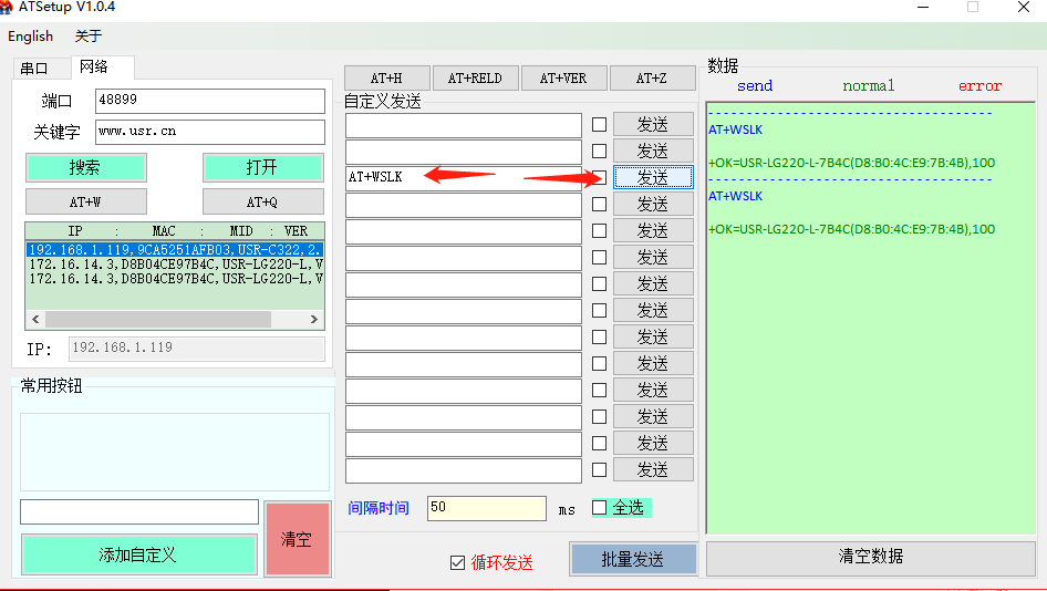 5) 也可在此界面發(fā)送AT指令進(jìn)行查詢或配置,發(fā)指令無返回時(shí),需要重新點(diǎn)擊“搜索”。