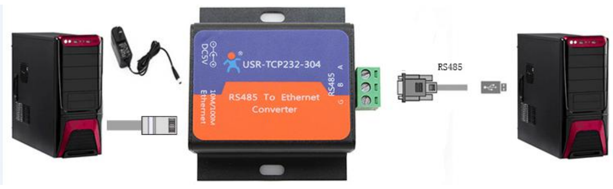 將304接入標準得適配器電源,將304得網(wǎng)口和電腦得網(wǎng)口鏈接起來,通過USB轉(zhuǎn)485串口線鏈接到電腦上。如圖所示: