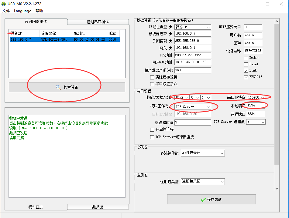 2. 打開設(shè)置軟件:USR-M0_V2.2.1.272,點擊“搜索設(shè)備”,搜索到設(shè)備后選中設(shè)備,修改304得參數(shù),串口參數(shù)測試時可以默認(如果需做改動,可以直接修改),設(shè)置“模塊工作方式”為“TCP Sever”,“本地端口”設(shè)置為“1234”,然后點擊“保存參數(shù)”。