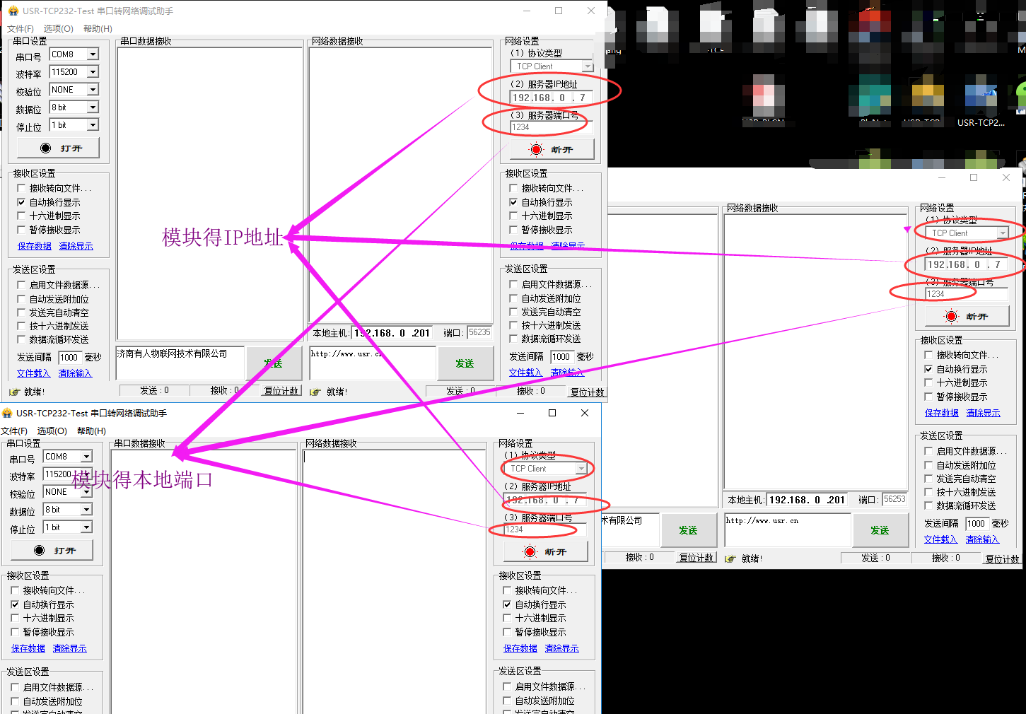 4. 打開3個測試軟件:USR-TCP232-Test-V1.3,分別與我們得模塊建立socket鏈接,如圖所示: