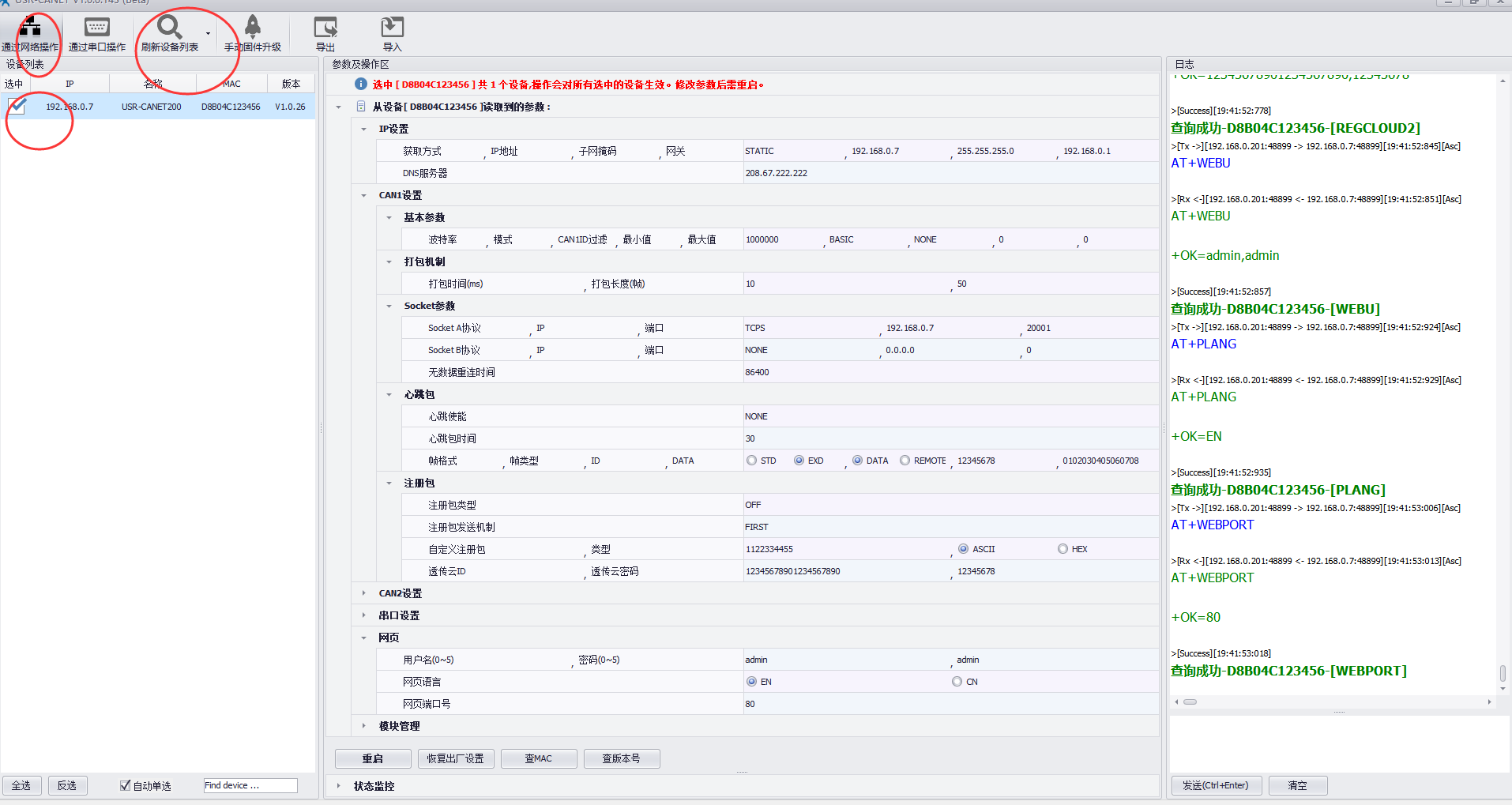 2.打開(kāi)設(shè)置軟件:USR-CANET V1.0.0.143 (Beta),點(diǎn)擊通過(guò)“網(wǎng)絡(luò)操作”,然后點(diǎn)擊“刷新設(shè)備列表”,搜索到設(shè)備之后,勾選到相關(guān)的設(shè)備。設(shè)備的參數(shù)會(huì)刷新。