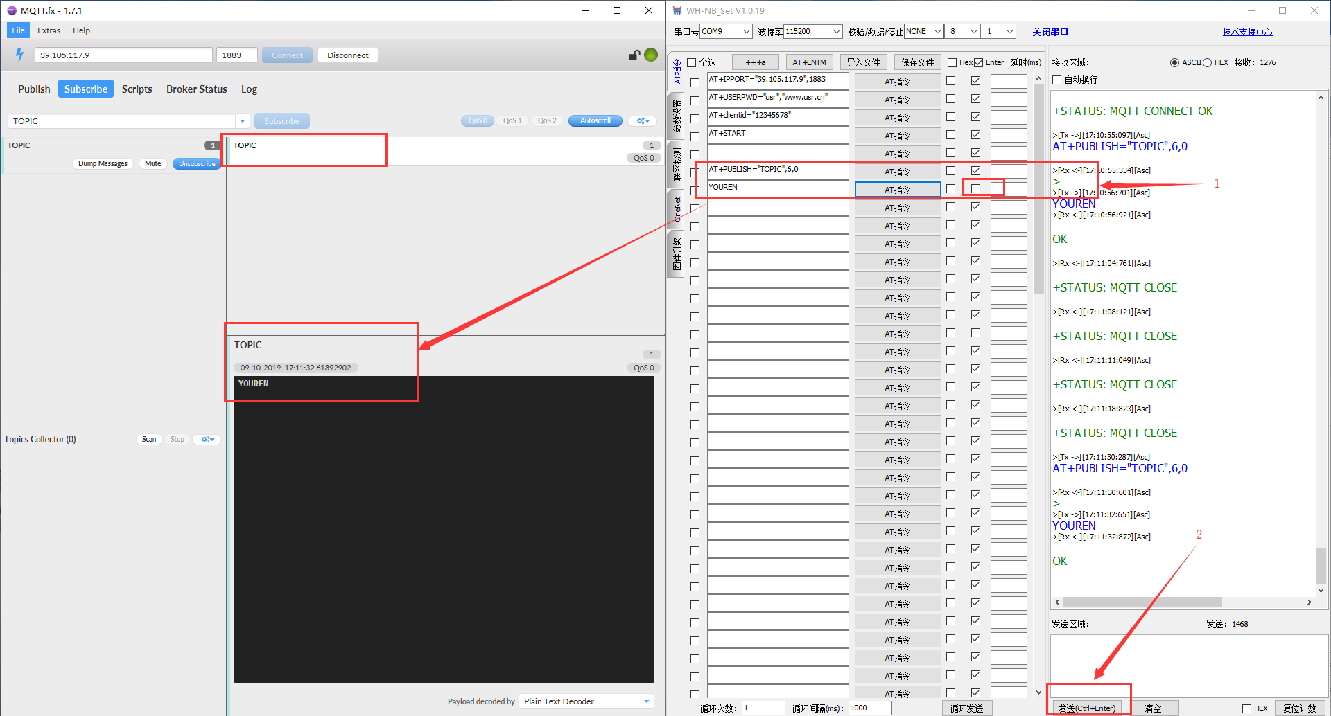 2. 在MQTTfx選擇Publish,輸入TOPIC,下面正文輸入YOUREN1,點擊Publish,即可在串口端收到消息,如下圖