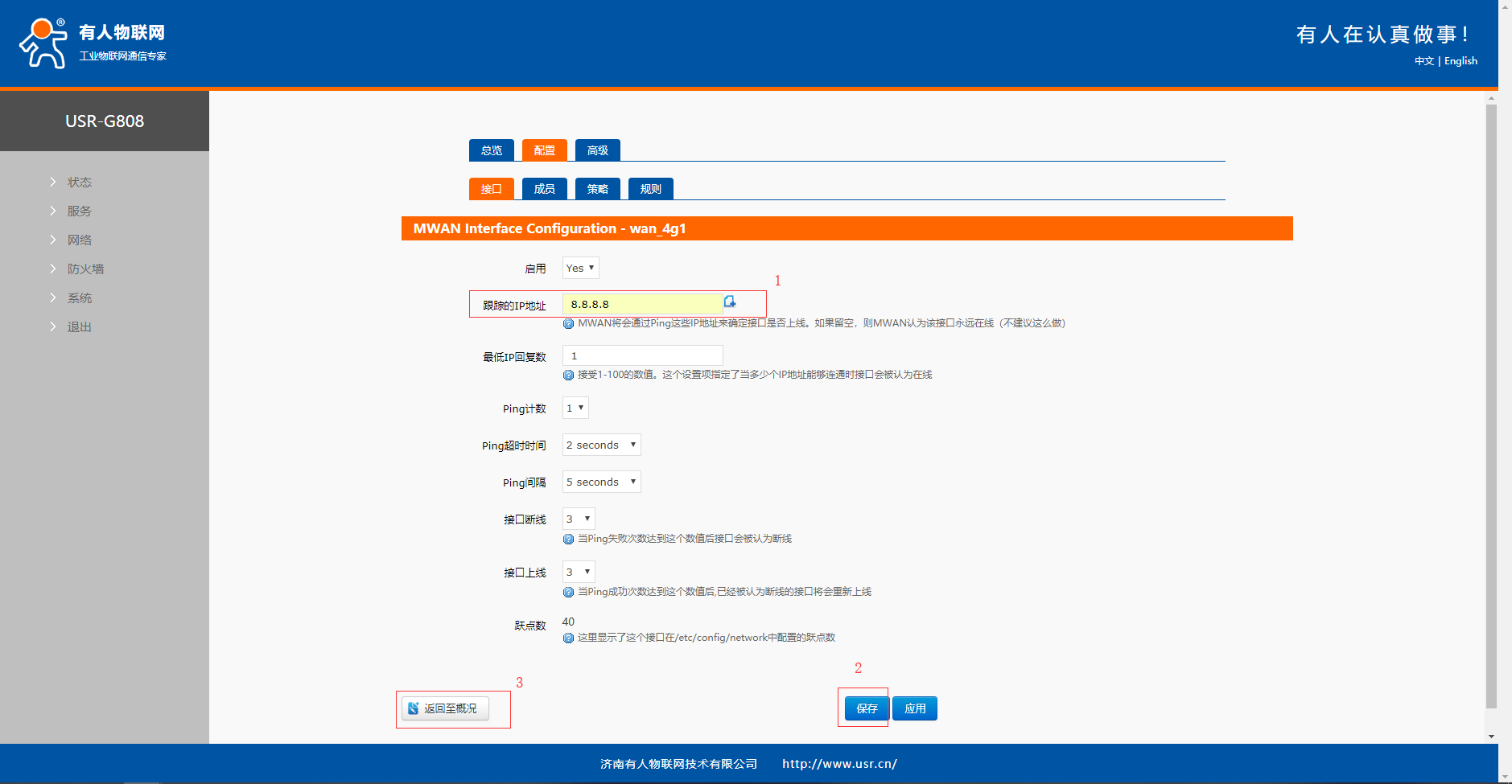 界面跳轉,設置跟蹤的IP地址為8.8.8.8,然后點擊保存,保存完畢后點擊返回至概況跳轉至添加接口界面繼續(xù)添加接口2,步驟與上述一致。