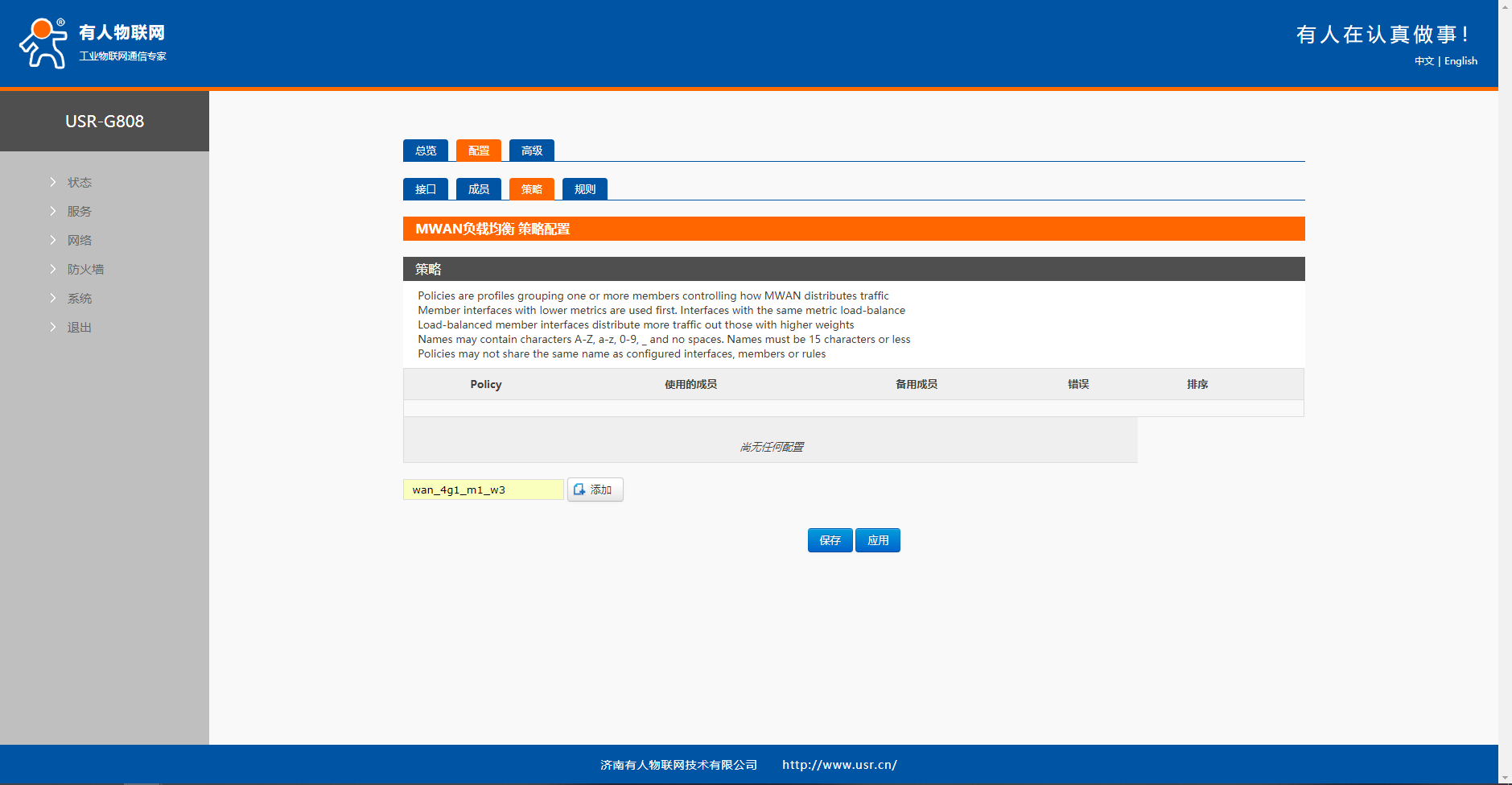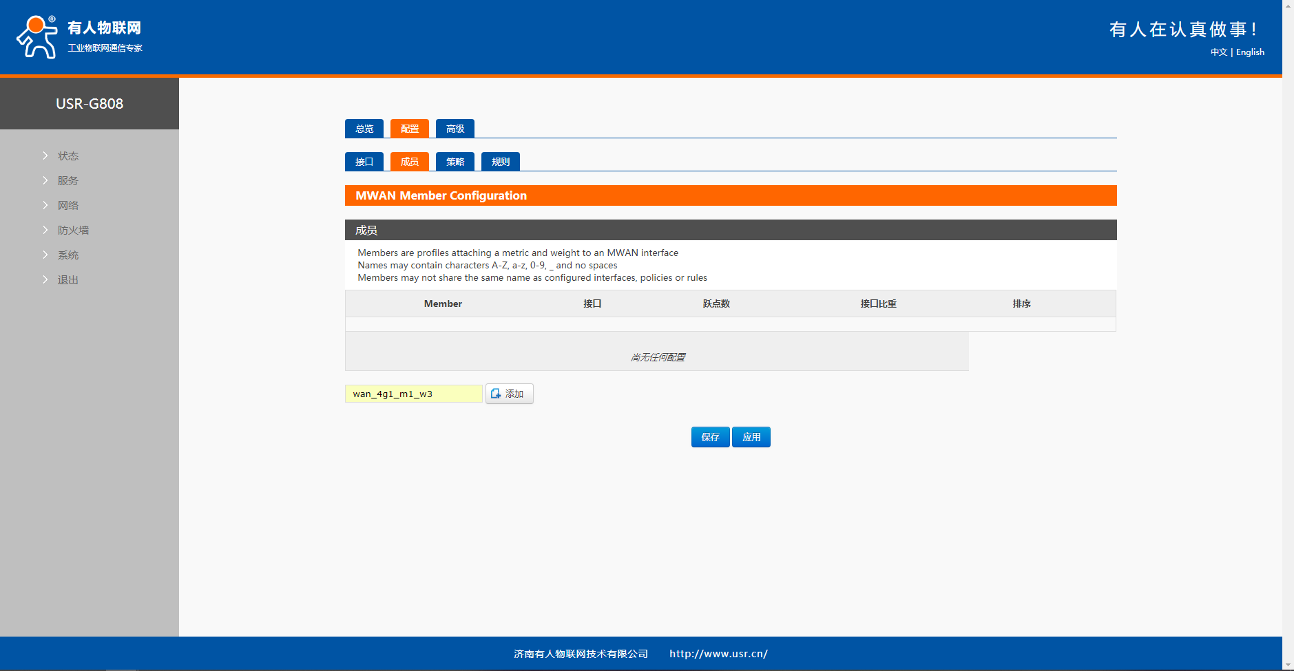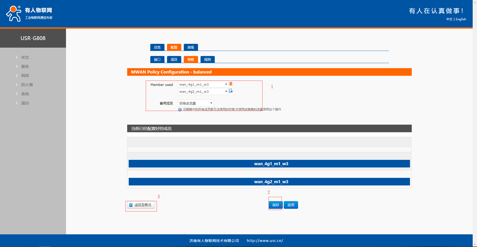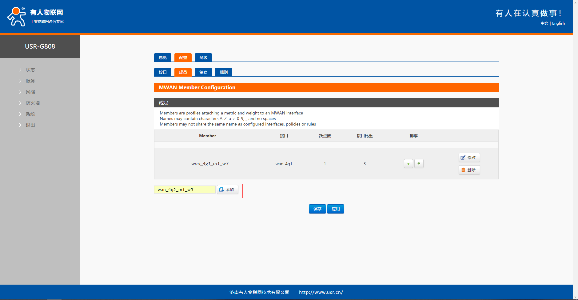 點擊配置----成員進入成員配置界面。添加成員(成員名稱可以自定義),這里是 wan_4g1_m1_w3 和 wan_4g2_m1_w3 后,點擊添加