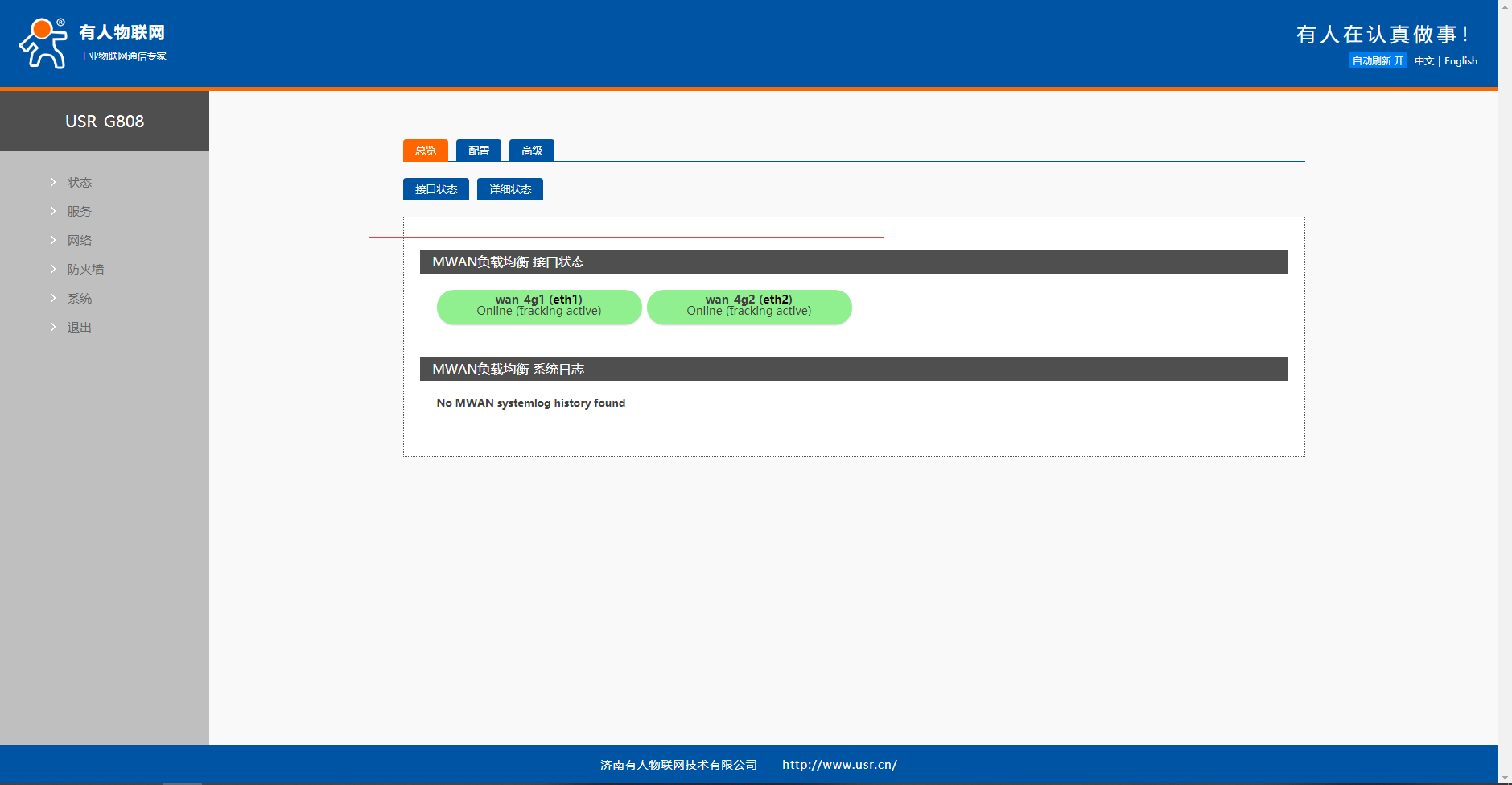 待設備重啟完畢后,可以在總覽里點擊接口狀態(tài),發(fā)現(xiàn)兩個接口變成綠色表示配置成功,紅色表示沒有成功。在詳細狀態(tài)里面可以看到兩個接口的進行的負載占比。