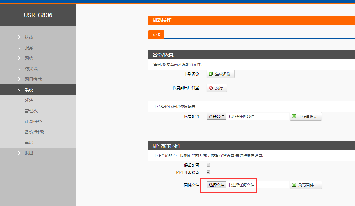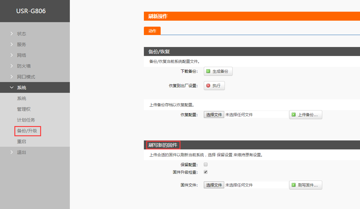 3、在系統(tǒng)中選擇備份/升級(jí)選項(xiàng),可以看到有刷寫新的固件的選項(xiàng)卡。