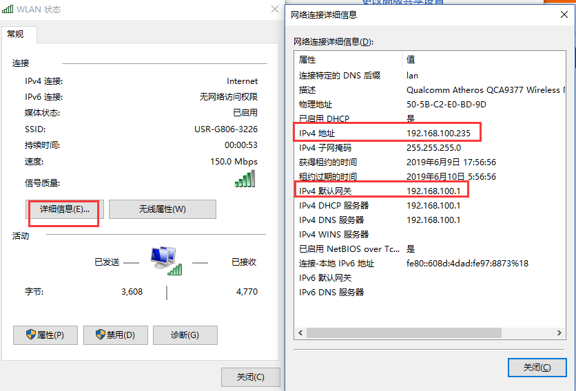 2) 雙擊該網(wǎng)卡,顯示詳細信息,查看電腦獲取的IP