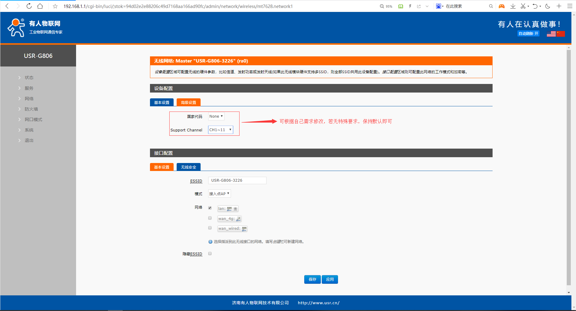 4、 在接口配置----基本設(shè)置中,ESSID即WiFi信號的名稱,默認(rèn)為設(shè)備型號+MAC后4位。
