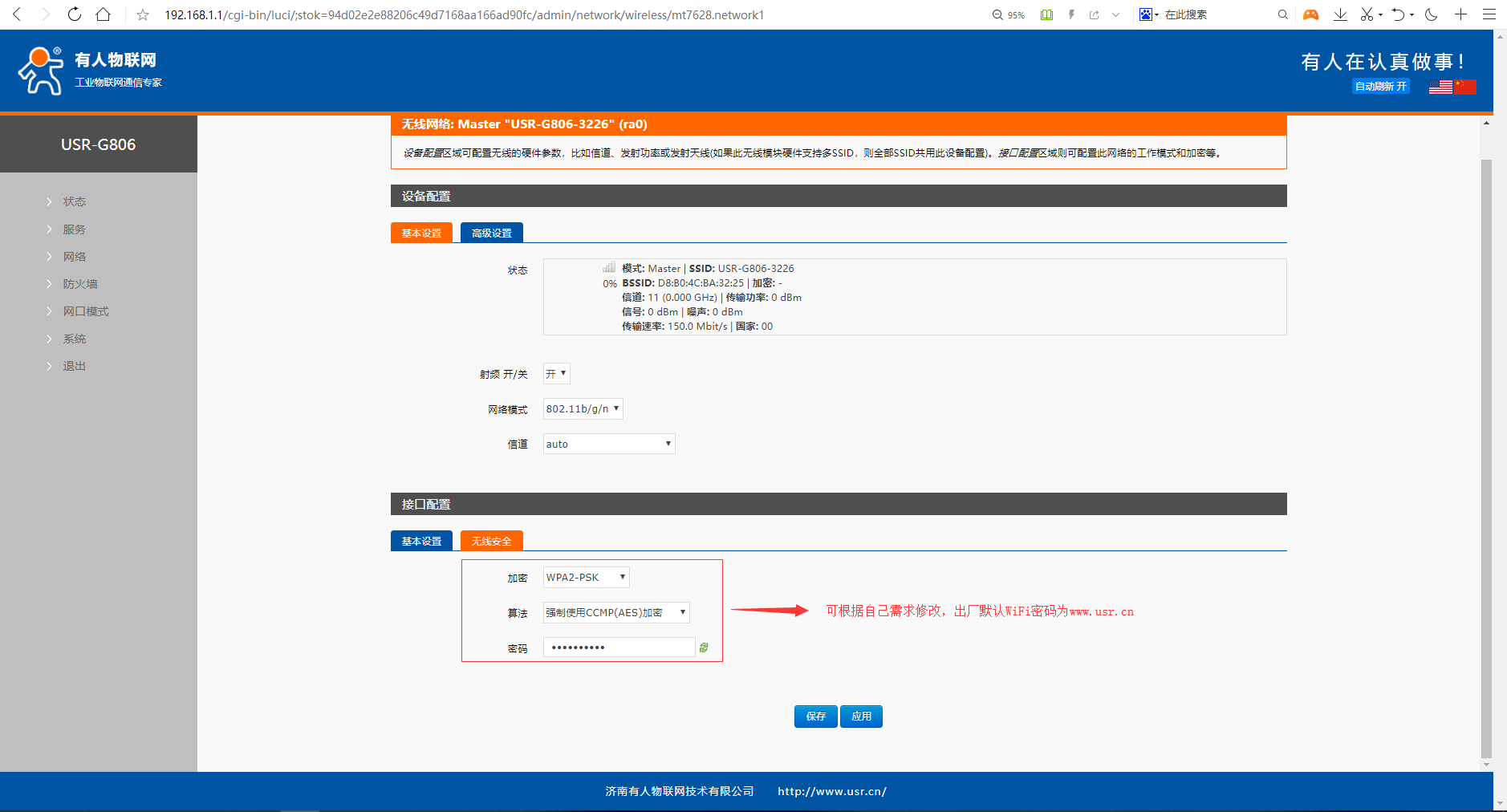 5、 在接口配置---無線安全中可以修改該WiFi的加密方式,默認(rèn)加密方式為WPA2-PSK,默認(rèn)密碼為lifj.com.cn