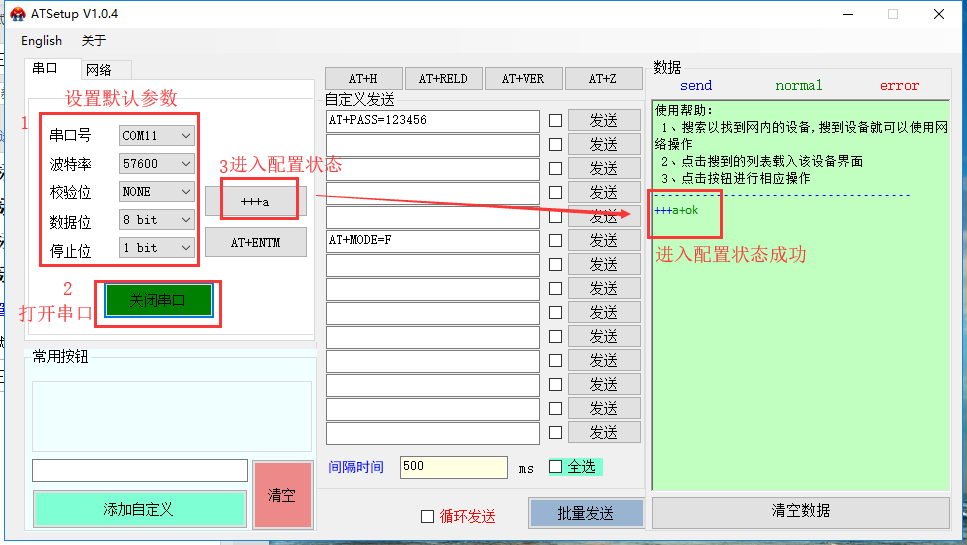 ,依次點擊打開串口(選擇A、B、C對應(yīng)的串口號,串口參數(shù):57600,None,8,1,)、進(jìn)入配置狀態(tài)、發(fā)送AT指令進(jìn)行配置。