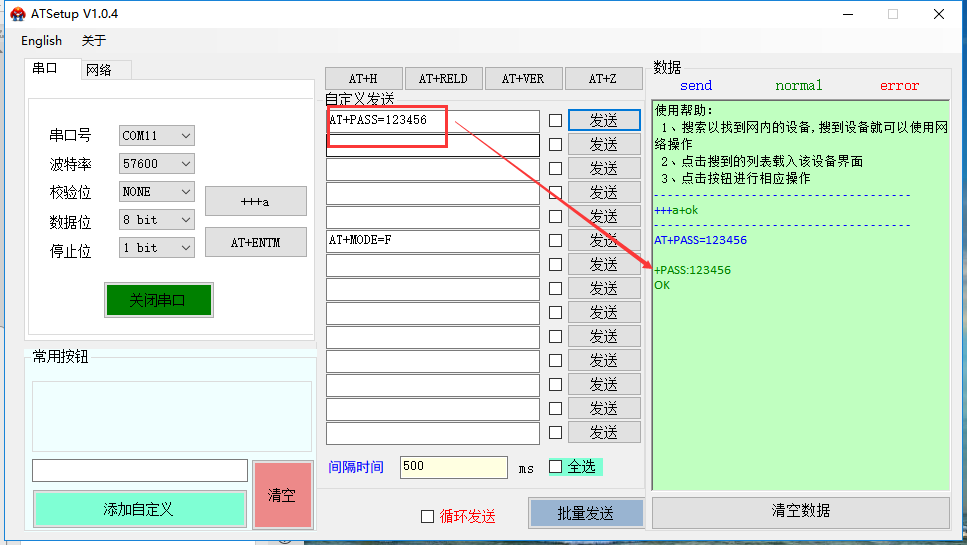3、用AT指令設(shè)置通訊密碼: