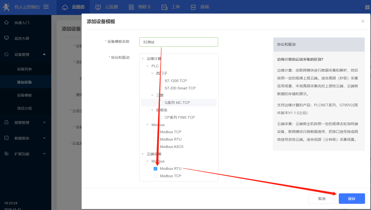 7、模板更改名稱,選擇modbus rtu協(xié)議,點擊保存