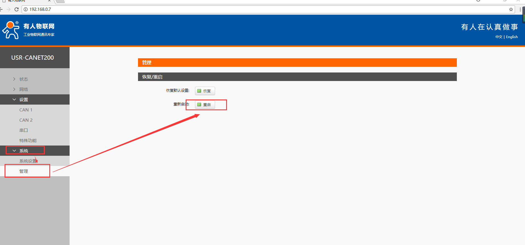 2. 瀏覽器輸入地址192.168.0.7,進入canet200的內(nèi)質(zhì)網(wǎng)頁,選擇設(shè)置->特殊功能->can轉(zhuǎn)485->打開can1,如圖所示,然后重啟。